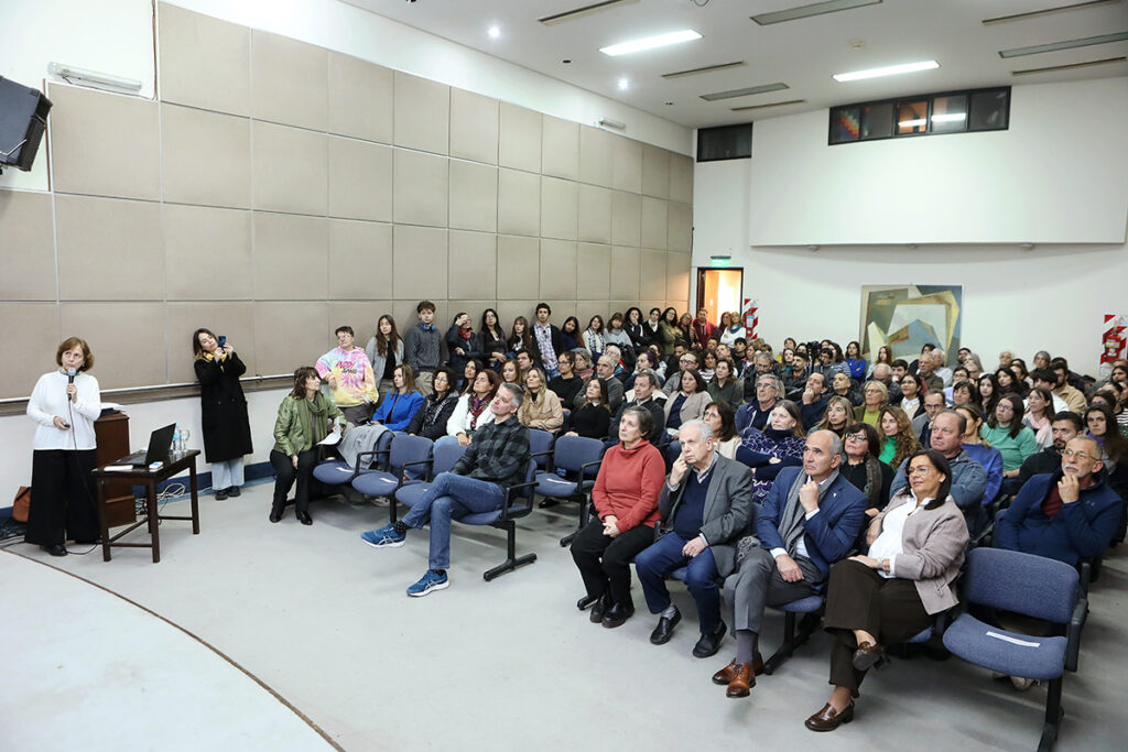 Previo al conversatorio, el decano de la Facultad de Ciencias Naturales y Museo hizo entrega de un reconocimiento al trabajo y la trayectoria de la doctora Cristina Damborenea, investigadora de esa unidad académica y del CONICET, integra la división Zoología Invertebrados del Museo de La Plata.