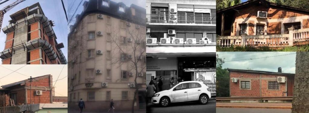 Se propone un modo casi homogéneo de construcción con un uso variable de energía en climatización sin considerar la variable climática y la adaptación al sitio o el uso de pautas bioclimáticas. En la Figura 1 puede observarse la unidad exterior de varios equipos de aire acondicionado tipo Split, utilizados para compensar la falta de confort higrotérmico en el interior de los edificios. En primera instancia, las prácticas expuestas en la imagen parecieran enfocarse a resolver sólo la reducción del costo inicial del edificio. De modo que, son los usuarios los que deben enfrentarse al problema de resolver las patologías causadas por el tipo de ocupación y los altos costos operativos para calefaccionar y refrigerar el espacio. Lo descrito señala una alta ineficiencia energética de los edificios, que ha sido corroborada por numerosas investigaciones en las últimas tres décadas por grupos de investigación en las diferentes regiones del país. De este modo, se ha llegado a establecer un valor excesivo de demanda energética por m2 habitable o km2 urbanizado, si lo comparamos con países desarrollados.