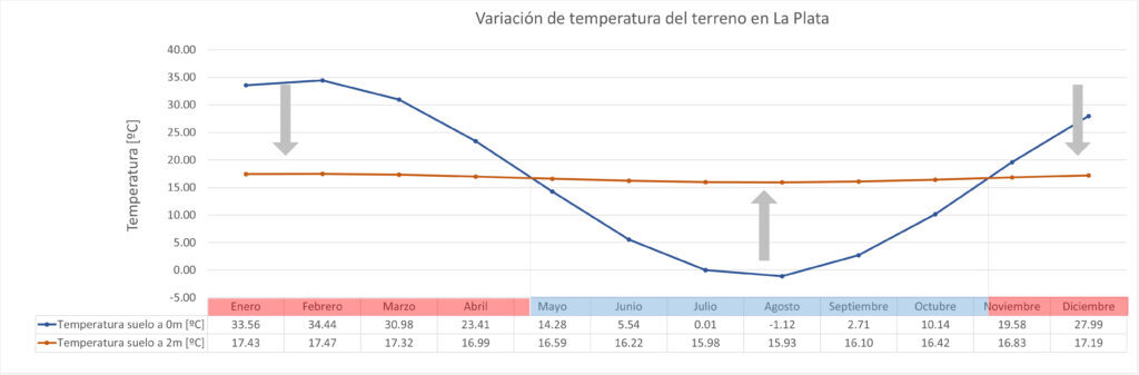 La energía geotérmica de baja temperatura, también conocida como de baja entalpía o somera, basa sus aplicaciones en la capacidad que el subsuelo posee de acumular calor y de mantener una temperatura sensiblemente constante a determinada profundidad (usualmente más de dos metros de profundidad) a lo largo de todo el año. Generalmente corresponde a la temperatura media anual atmosférica del sitio. Los pozos canadienses son intercambiadores de calor, por donde el aire exterior ingresa y recorre cierta cantidad de metros por un tubo enterrado antes de ingresar al interior del edificio; los mismos pueden tener entre 20 y 60 centímetros de diámetro. Durante ese recorrido, el aire exterior cambia su temperatura buscando el equilibrio con la temperatura del terreno (Figura 3). En la Figura 4 se observa la variación de la temperatura del suelo correspondiente a la ciudad de La Plata, (en superficie y a 2 metros de profundidad durante los diferentes meses del año).
