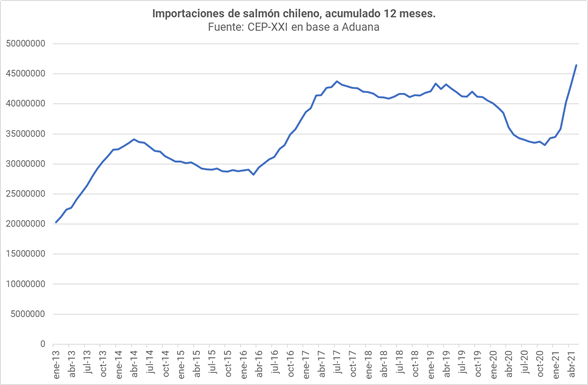 1) Argentina es importadora de salmón. Todo viene de Chile, donde la actividad está muy desarrollada. En los últimos 12 meses importamos salmón por más de 45 millones de USD, cifra récord para las importaciones de este pescado.