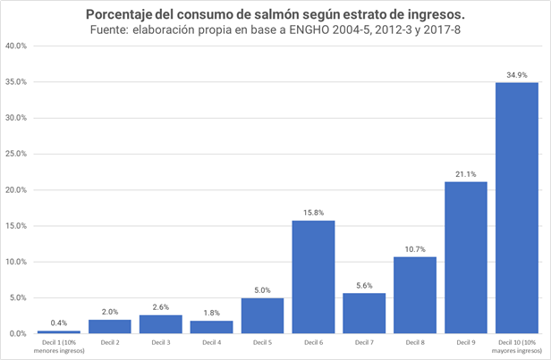 3) El salmón es un consumo de hogares de ingresos medios y altos. Más de la mitad del consumo de salmón en los hogares lo explica el 20% de mayores ingresos. Esa cifra sube aún más si contemplamos el gasto en salmón vía restaurantes (mayormente sushi).