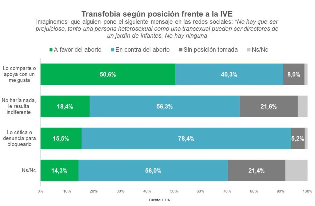 2. En el segundo caso, se testeó qué pasaría con un contradiscurso, es decir, un discurso orientado a desarmar prejuicios y discursos de odio —en este caso, el prejuicio de la transfobia en el sistema educativo—. Lo más interesante sucede entre aquellos que, frente a este contradiscurso, optarían por denunciar su contenido en las redes para bloquear a su emisor: un 78,4 % está en contra de la IVE, mientras que tan solo un 15,5 % se manifestó a favor. El siguiente dato también es revelador: de entre quienes no harían nada frente a ese contradiscurso, el 56,3 % está en contra del aborto. Quienes compartirían el contradiscurso están relativamente diferenciados: un 50,6 % a favor del aborto y un 40,3 % en contra.