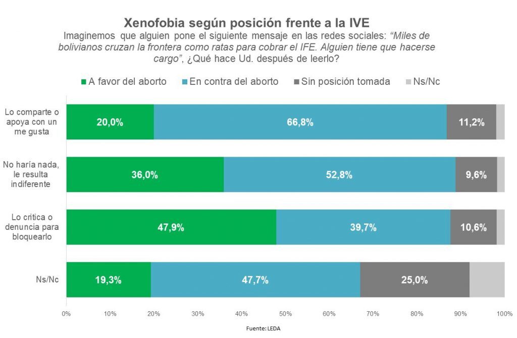 3. Dentro de este avance que presentó el LEDA en el marco de su investigación cuantitativa sobre nuevos autoritarismos, el tercer enunciado es el más significativo. Se trata de un discurso cosificador, bastante típico en las redes sociales, que expresa su carga xenófoba a través de una identificación de su objeto de odio con un animal abyecto. El 66,8 % de quienes compartirían o apoyarían este enunciado xenófobo se manifestaron en contra de la IVE, mientras que solo el 20 % se manifestó a favor. La articulación entre agresividad, cosificación y xenofobia que opera aquí se expresa con elocuencia a partir de la distinción de posiciones en el debate sobre el aborto.