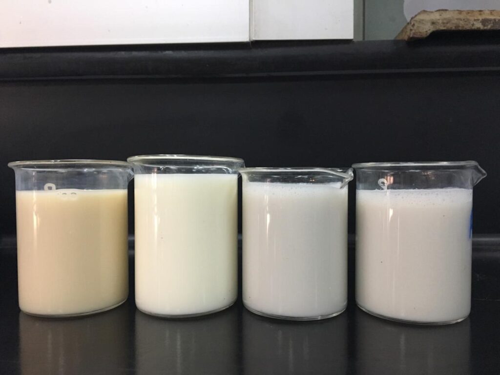 En el caso del proyecto de elaboración de la bebida de caupí-arroz simil leche bovina, el trabajo de investigación implicó ensayos para la obtención de un extracto proteico por “solubilización alcalina” de mezclas de harinas de caupí y arroz, que se emulsionó (por agitación y ultrasonido) con 1,5% de aceite de girasol y al que se agregó goma xántica como estabilizante.